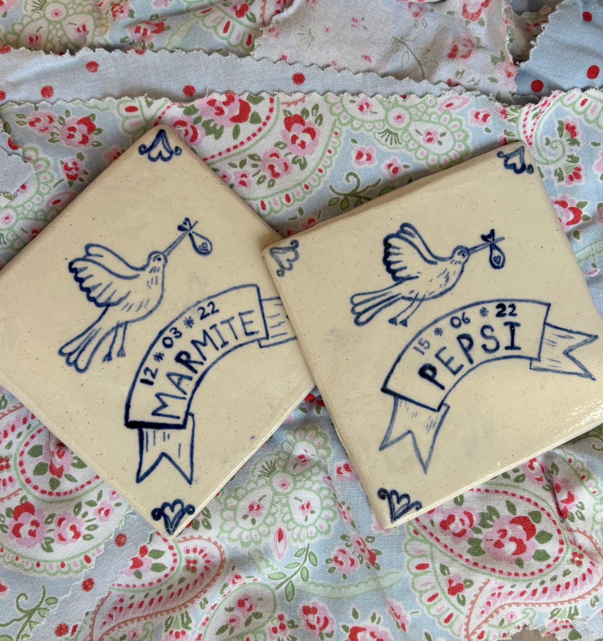 Celebrate a new arrival with a custom ceramic newborn tile, handmade from stoneware clay and finished with oxides and a transparent glaze. Each tile is hand-painted with a stork and ribbon motif, and personalised with your choice of baby name and birth date.
