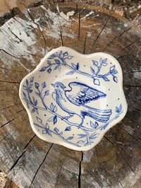 Hand built stoneware dish with blue oxide and shiny glaze. This can be used for both food or decorative purposes.