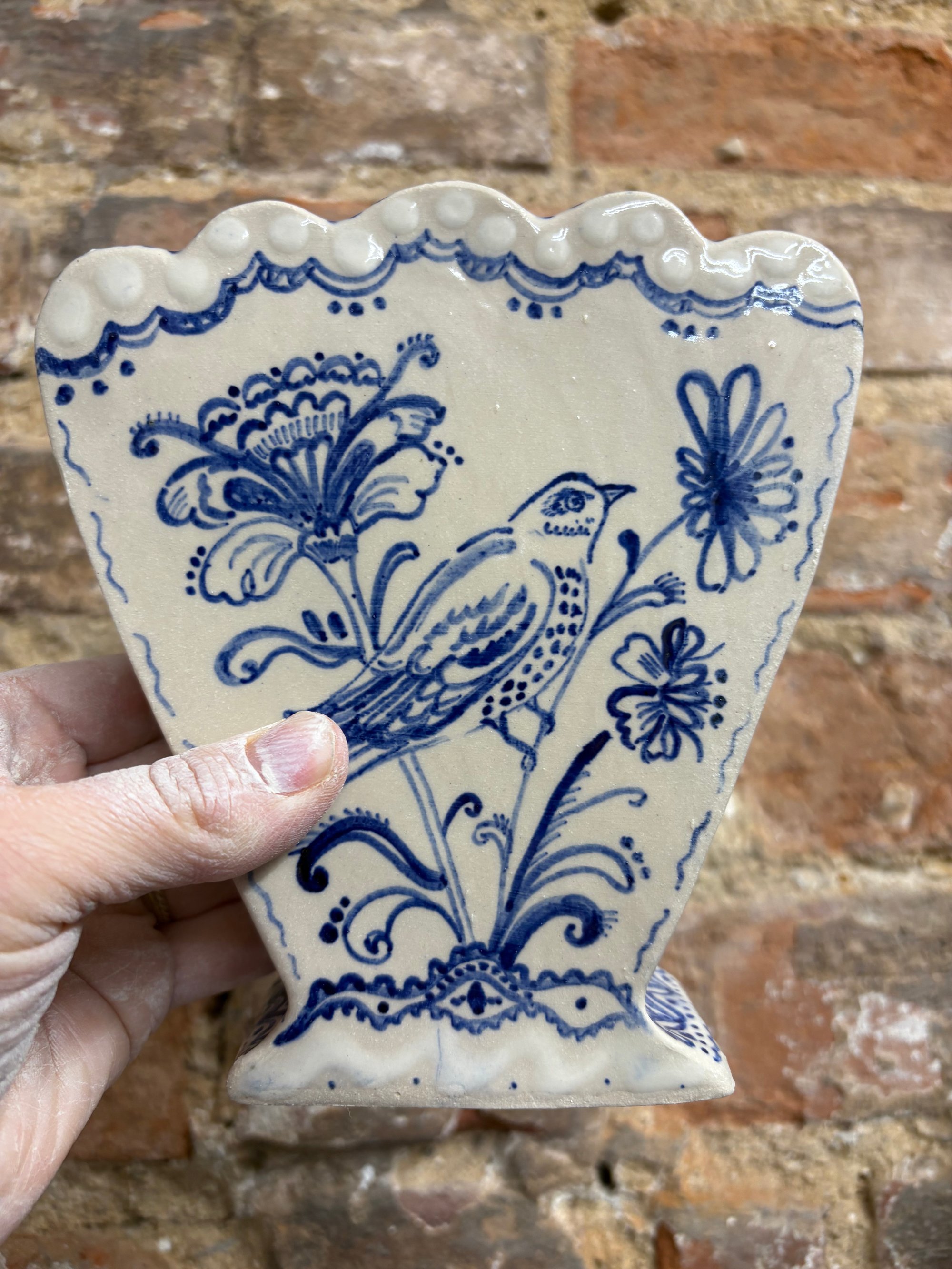 This unique piece features a charming songbird and a delicate floral pattern, inspired by the flowers and wildlife found in the Norfolk countryside with folk art and delftware inspiration.