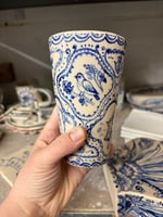 A handless mug. Handmade using stoneware and hand decorated with blue oxides and transparent glaze. With delftware and folk art influences.